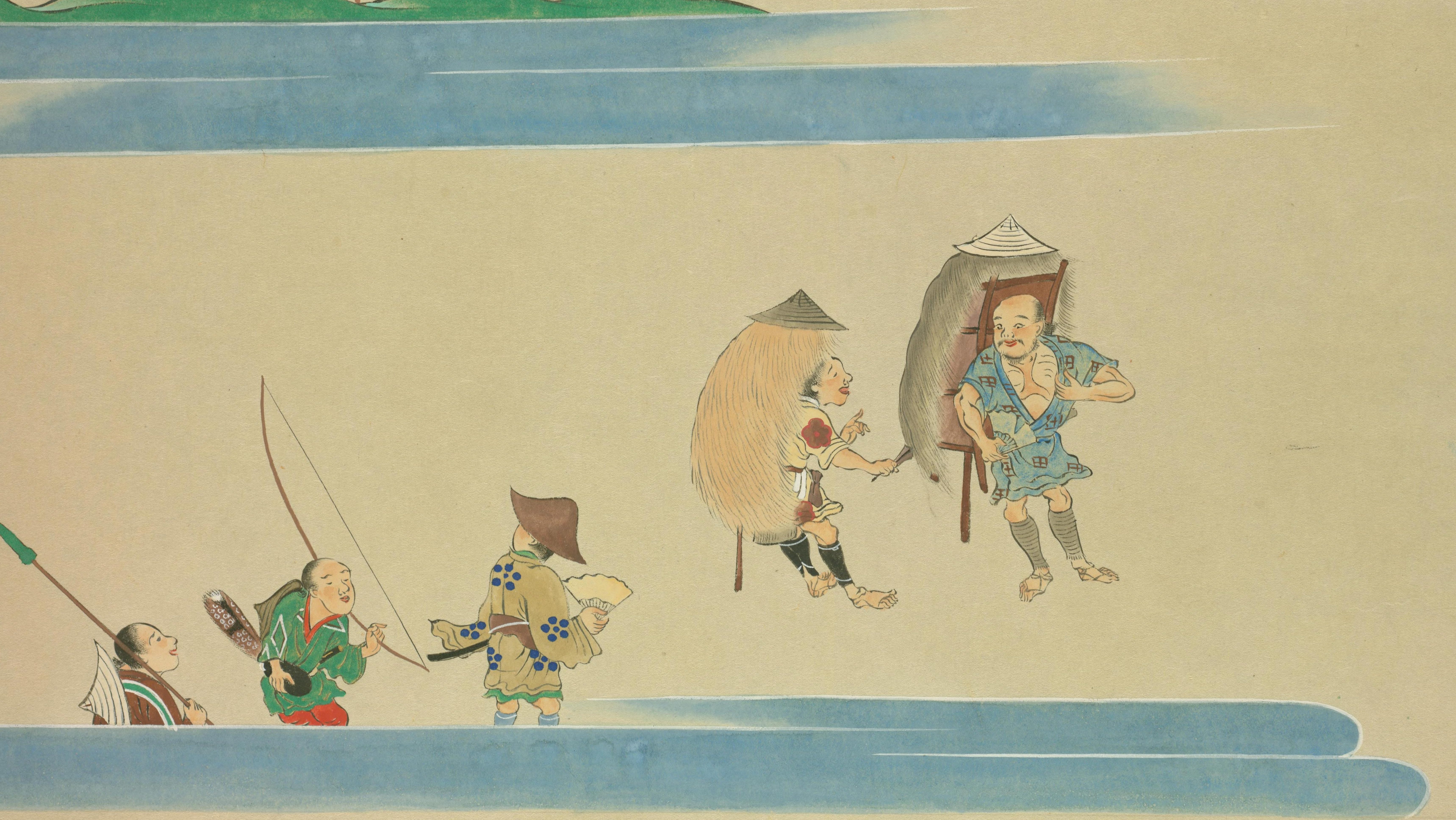 This type of hat shows up in several different picture scrolls. Its shape is also very similar to a jingasa, which were meant for the battlefield. Jingasa had the same pointed shape as kakugasa, and were worn by warriors as a kind of helmet. They could be made of leather, lacquered paper, or metal. They varied in diameter, but the peaked shape was very common.