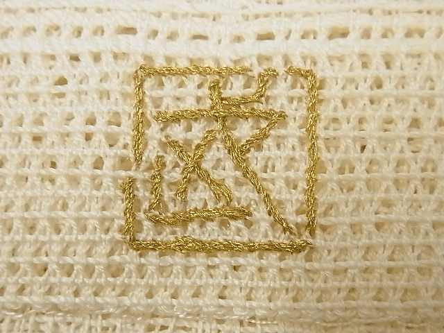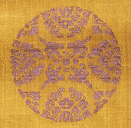 This is a silk fabric that uses a 3×1 twill structure (triple weft threads) with raw silk in the warp for the base cloth. The decorative weft threads float between these threads to create patterns that are raised, giving them the appearance of embroidery. This sort of triple twill is also sometimes called fusen ryo (浮線), especially when it features a roundel pattern.