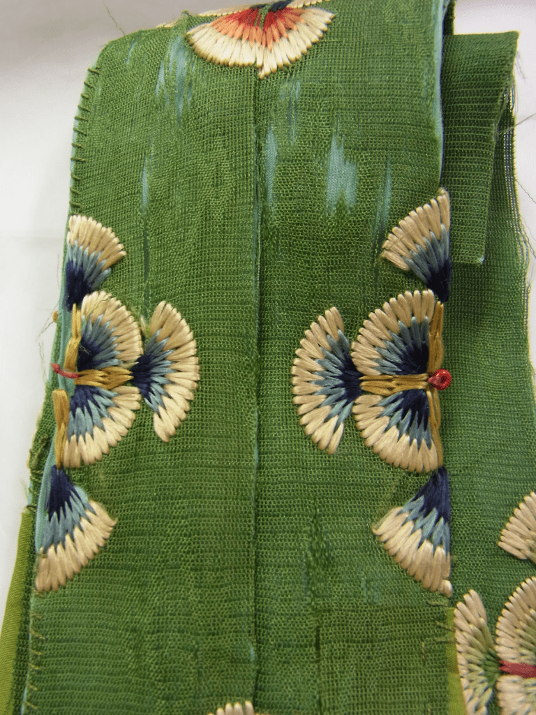 This is complete conjecture, but if linings were reused face garments, I would expect them to be a probable face garment weight. An older kimono seamstress recalling garments from early in her work said that old kimono tended to have indistinguishable face and lining weights on the bolts, because silk was so precious. Of course she was talking about the Taisho era and not the Momoyama era, but it made me consider thinking about linings as redyed face fabric, or just reused face fabric.
