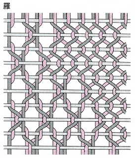 Ra is an open weave textile with a net-like appearance. It is woven using raw silk or half-raw silk, which is silk with about half its sericin removed. Each warp thread is intertwined with its adjacent warp threads, creating a net-like appearance. It originated in China and was introduced to Japan around the first half of the 4th century. Production began in Japan during the Asuka period. Its production began to decline during the Kamakura period, and stopped during the Muromachi period. Sha and ro, introduced from the Ming Dynasty, replaced it.