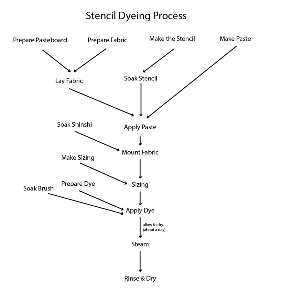 The steps are simple, but there are many of them, and none can be skipped. Like many traditional crafts, katazome requires patience and attention to detail, but breaks and periods of rest are also built in. If you have space, you can stagger the process among multiple concurrent projects to keep yourself occupied, as professional dyehouses do – they store drying projects in the rafters of their shop or in neat stacks of cloth hanging between beams.