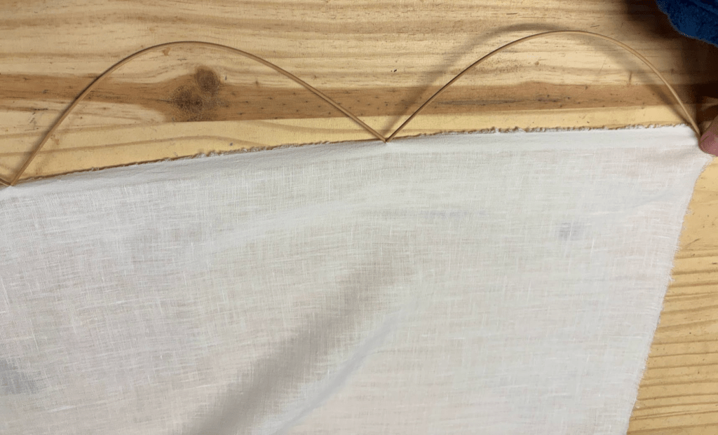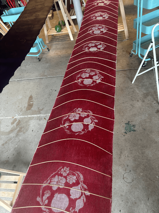 Once the harite are tied and the fabric bolt is taut, flip it over, and place the shinshi about every ten centimeters along the fabric. Make sure they are straight with the weft of the fabric, and bend them gently – they are easy to break.