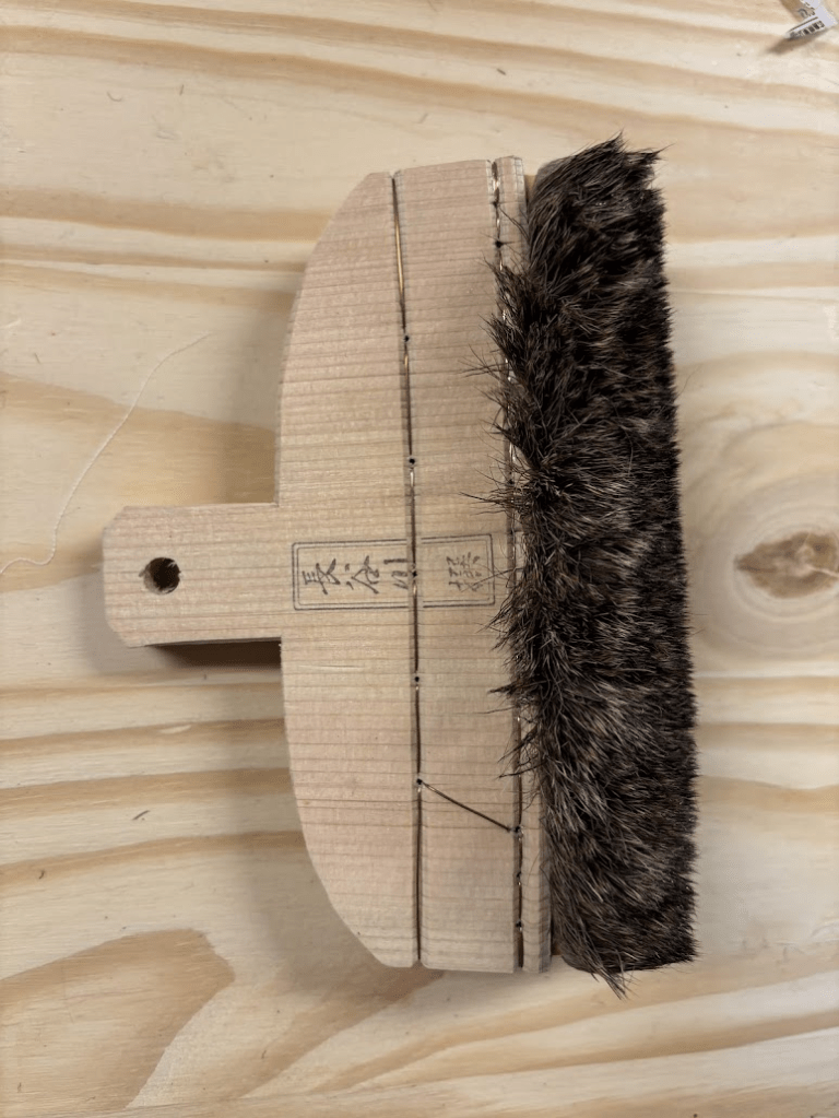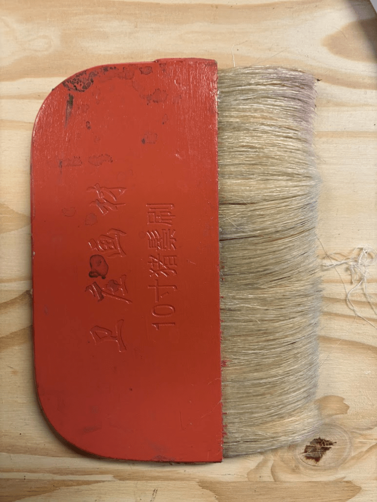 It should be noted that the traditional brushes used to apply sizing and large sections of dye, called hikizome, are unique and there is really not good substitute for them. The best short-term substitute is a wool hake brush or a particularly soft bristled pastry or paint brush, but you will need to be careful not to overapply sizing as they are more absorbent. They are also harder to hold comfortably in the right posture for a long time, and they are sometimes not as soft, so they do not glide over the paste quite right and they tend to disturb it more.
