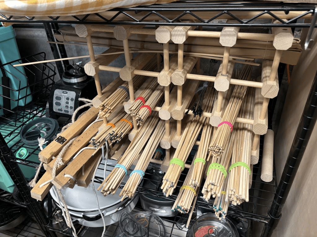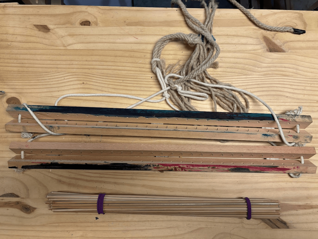 Once the paste is dried, the fabric is removed from the pasteboard and suspended from shinshi and harite. Shinshi are long thin bamboo rods with needles on either end. Harite are wooden clamps with needle “teeth” that hold the fabric along the length of the weft. Shinshi can be made on your own if you have a good source of very thick, old bamboo (like 2-3″ in diameter), but they take some practice. Ready made shinshi are cheap compared to alternatives like spring steel or carbon fiber. I recommend buying a small set of shinshi to start to understand what they are like. Personally, I am bad at splitting bamboo well and am happy to support Japanese craftsman.