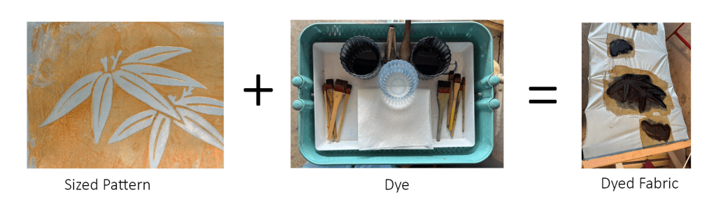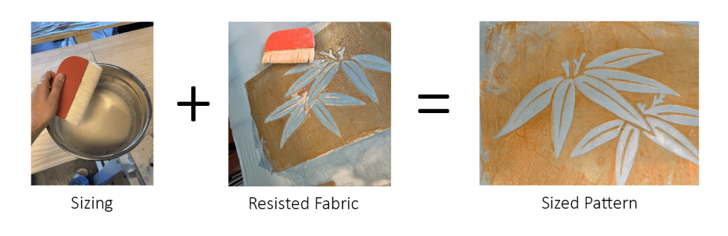 Sizing is applied to the fabric to help the dye absorb evenly. It also has the nice effect of stiffening the fabric a little bit, making it easier to apply dye. Soymilk sizing hardens the paste and makes it extra tough, while sodium alginate sizing gels it and allows you to scrape off mistakes (somewhat).