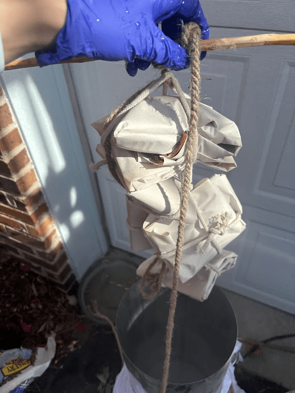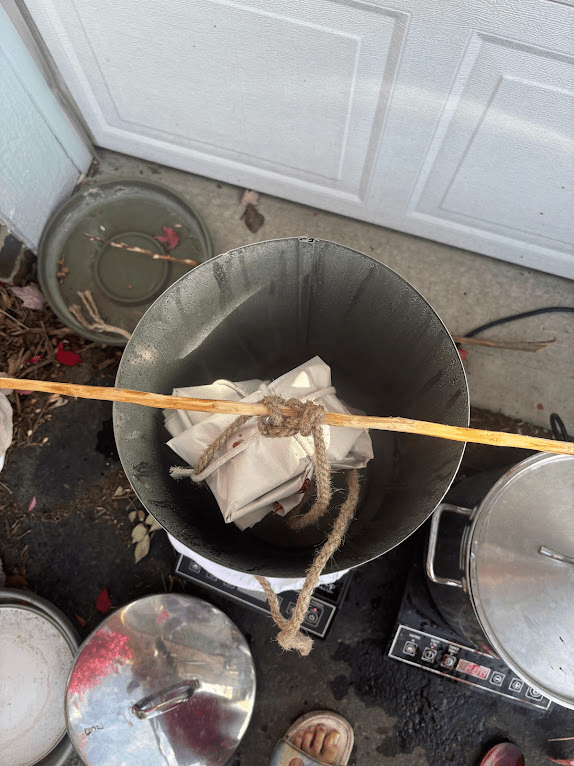 Try to make your vat as deep as your fabric’s width. This may require you to purchase a rope handled tub or a tough tote depending on the shape you need. If you’re using a natural plant indigo, you will need extra space at the bottom for the sediment, usually 1/3 more or up to 1/2. You can use a mesh screen at the bottom to keep sukumo from floating up.