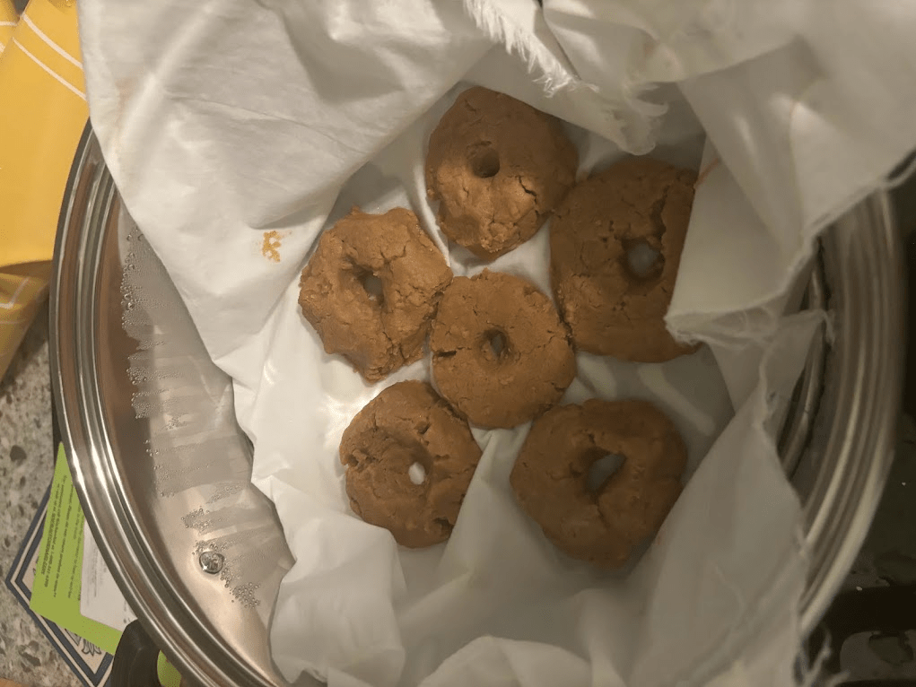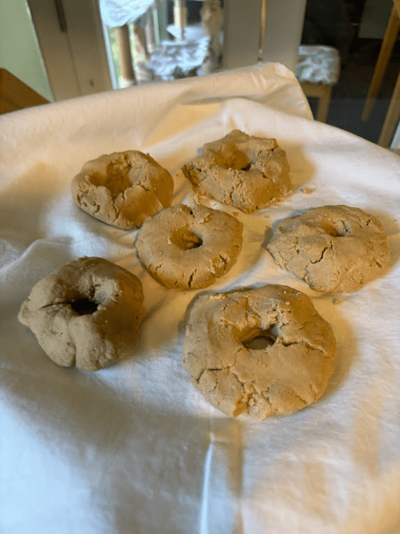 - Shape dough into doughnuts. Not American donuts, little mini donuts. The easiest way to do this is to make a round patty, and then stick your finger in the center until you bore through. The ‘roll a long noodle and loop it on itself’ approach does not work with this dough, it is not sticky or wet enough, it will just make a crumbled mess.