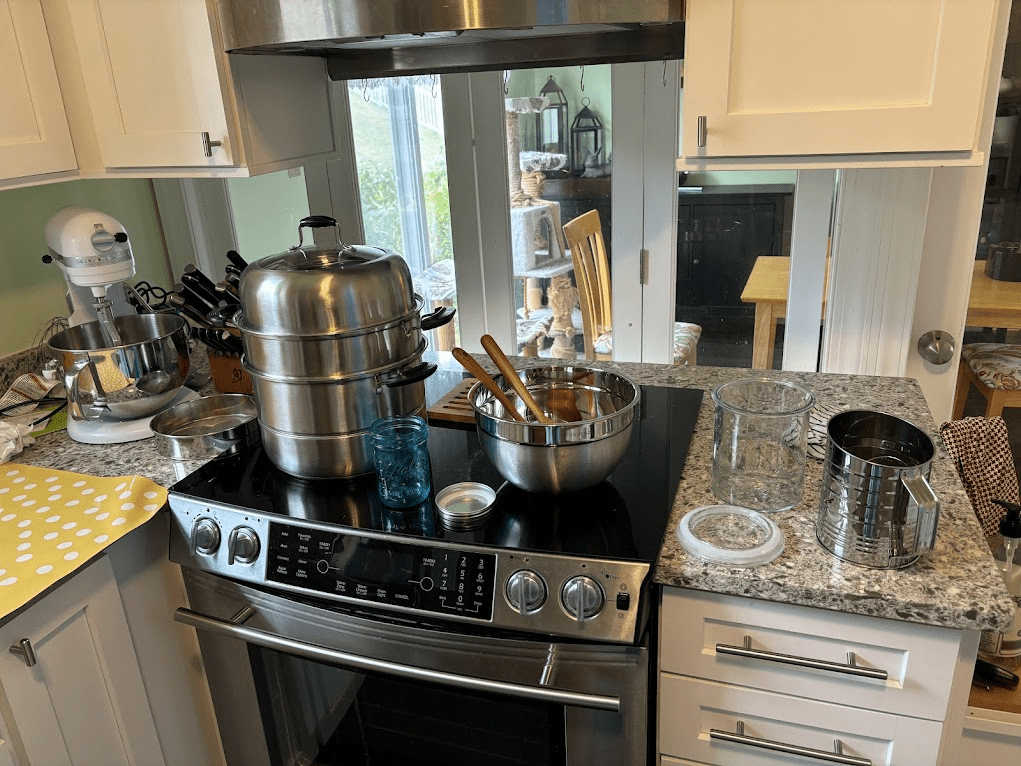 - While the doughnuts are steaming, decide how much salt to use, and dissolve it in as little hot water as possible. This will be about 1/4 to 1/2 a cup depending on the amount. You need salt when the humidity is low, or when you’re doing designs with large, contiguous blocks of paste, like those with white backgrounds. You need no to little salt in a hot and humid summer, and a large amount of salt in the winter. Salt keeps the paste from cracking by increasing the hydroscropity of the paste. Too much, and the paste will become very loose and run. Too little, and the paste will crack in the dry air. I recommend using less than a teaspoon of paste when it’s 80-90% humidity, or none, or up to 2 tsp in the winter. If you live in a very dry climate, increase the amount beyond that.