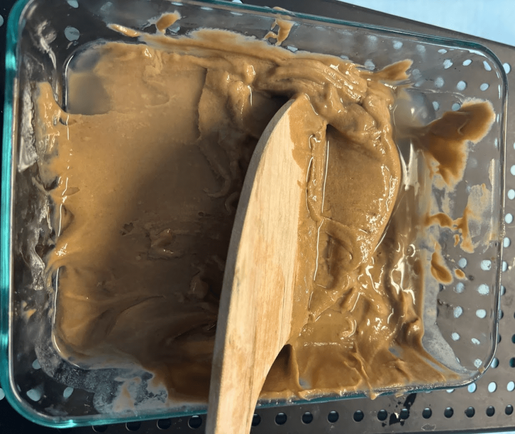 Once the stencils have soaked long enough, you will want to warm up your paste if you stored it in the fridge. If your paste is fresh made and warm, you can disregard this step. Otherwise, put your container in a bowl of hot water, and get some hot water ready to dilute it. If it’s a warm and sunny day, put it outside.