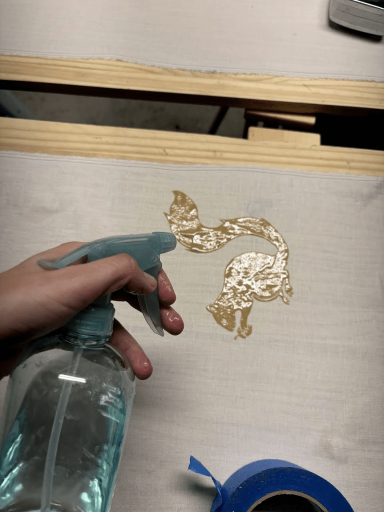 Leave the pasteboard to dry fully. Spray it with water. If it isn’t tacky, which is common for first coats on wood, add a second coat and allow it to dry fully as well. If you don’t allow the paste to dry fully before laying out the fabric, it can penetrate through the fabric and act as its own resist paste.