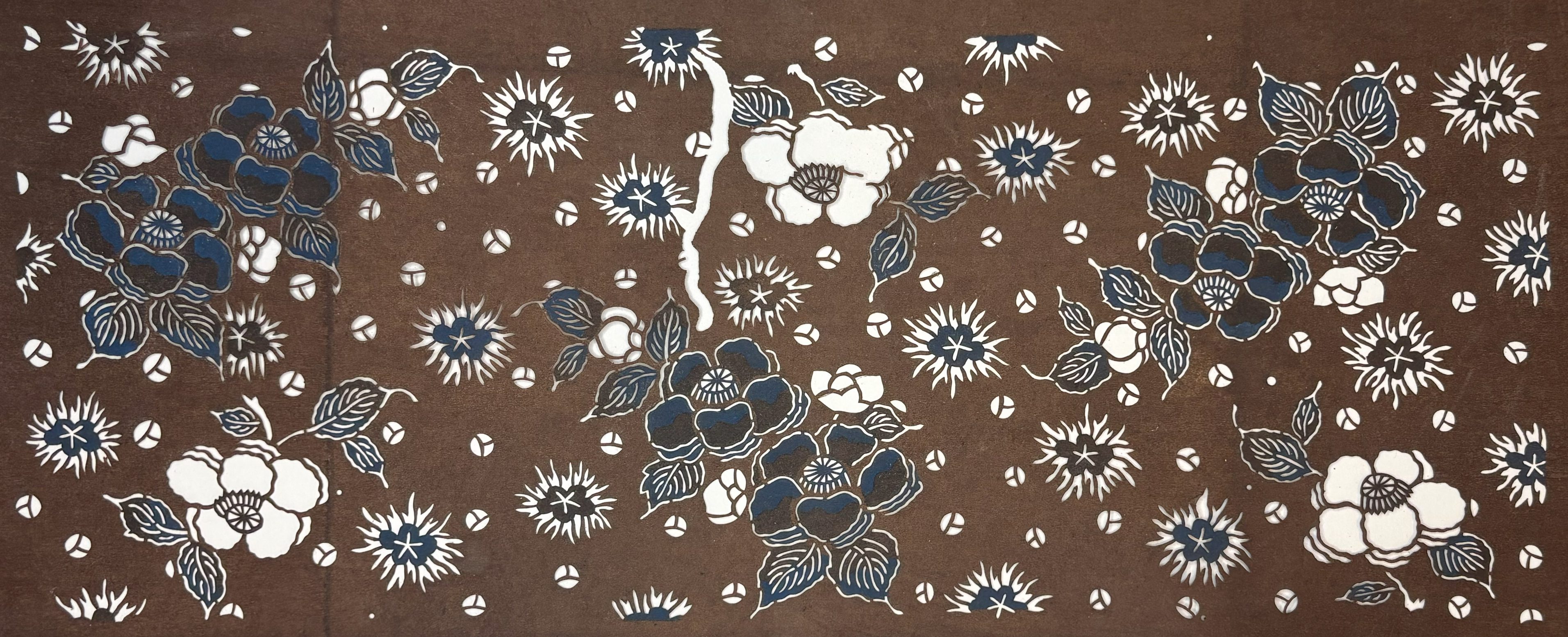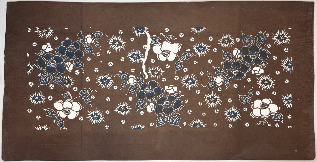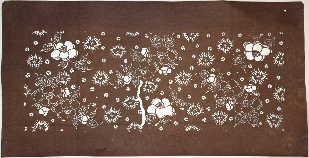 This stencil was used for surizome, and it either had a blue pigment or indigo used for its colorant. The blue is so bright I wonder if it was a mineral pigment instead of indigo, but I can’t be certain.