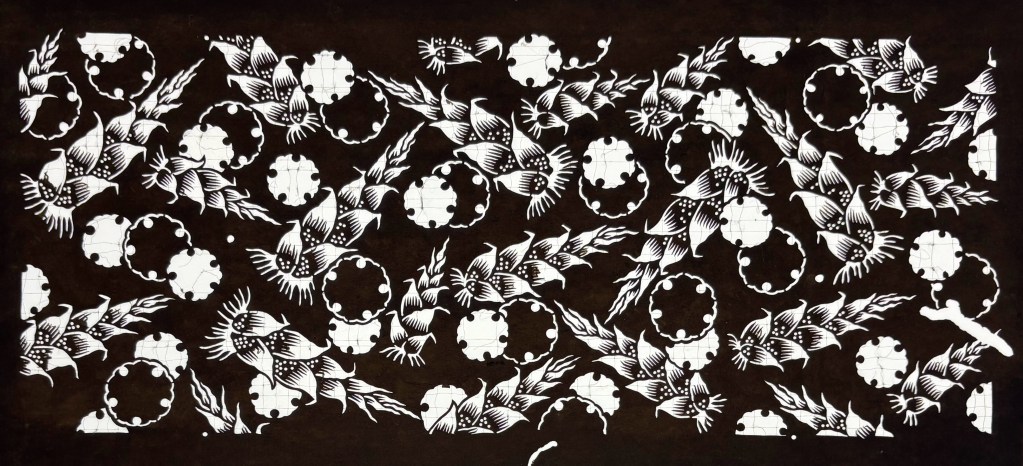 I have digitally repaired the stencil and colored it so you can imagine how it might have looked, choosing a light green reminiscent of young bamboo.