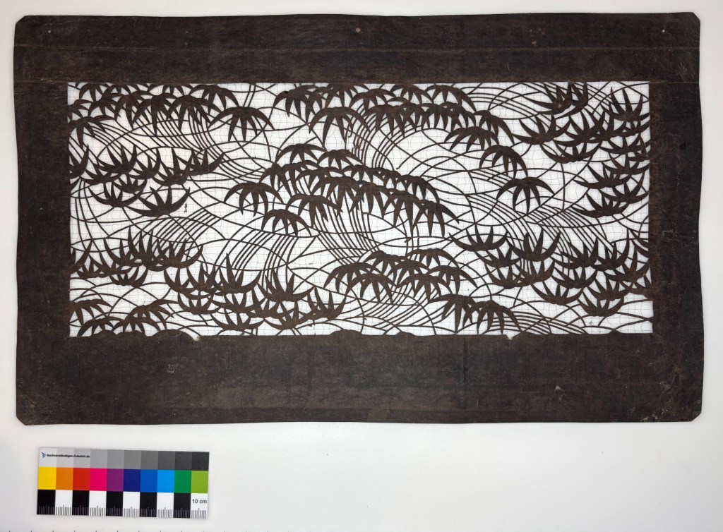 This feather-thin stencil has a delicate design of sasa, or bamboo grass. I can’t tell if this pattern would be for summer or winter; bamboo stays green in winter, so it’s often a winter motif, but the refreshing green leaves of sasa are a summer motif. Perhaps it depends how you color it! Either way, it’s a symbol of vitality and strength.