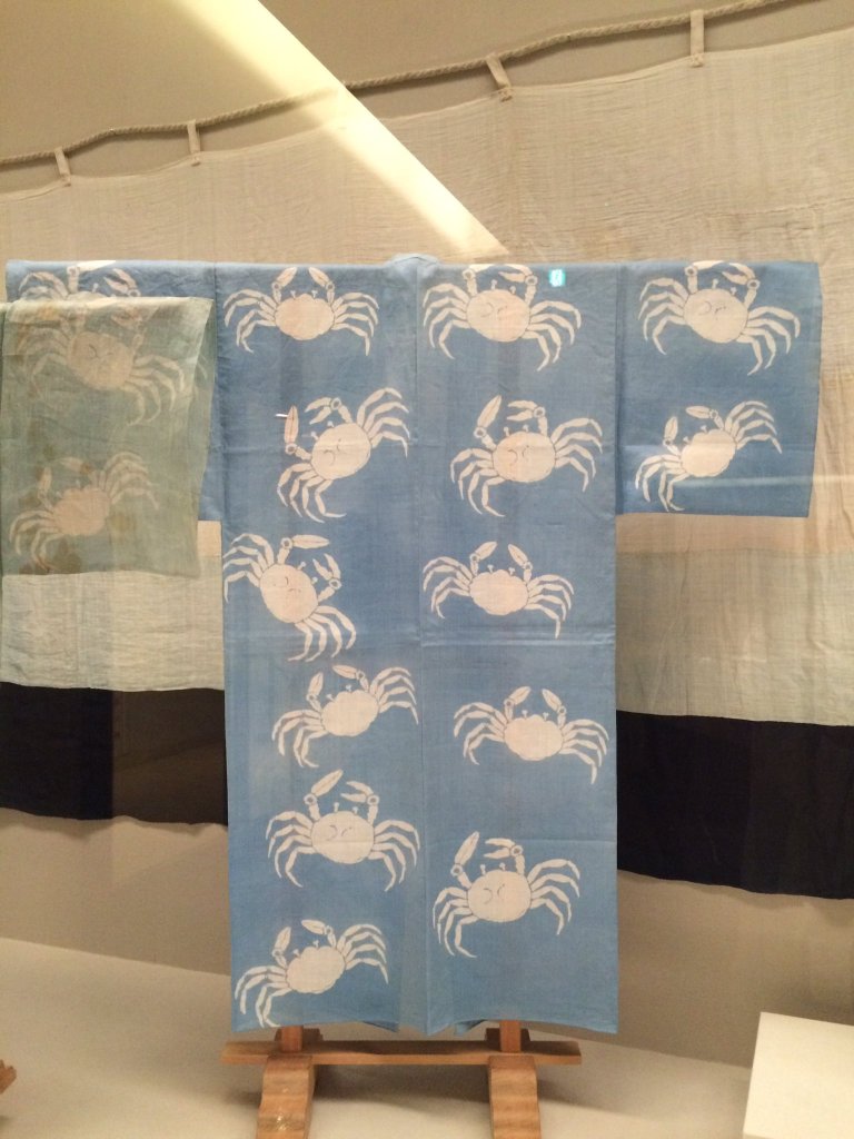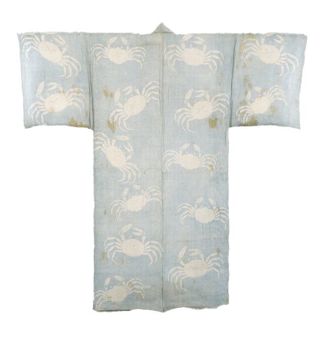 The extant piece is a katabira (unlined summer robe) owned by Tokugawa Ieyasu, the first shogun of the Tokugawa dynasty. It is dated to the Momoyama period. It is made of hemp, and dyed with stencil resist and indigo. The Tokugawa Art Museum recently did their own reconstruction of this garment, and they attempted to recreate the original color of this garment as well, which was a darker blue.