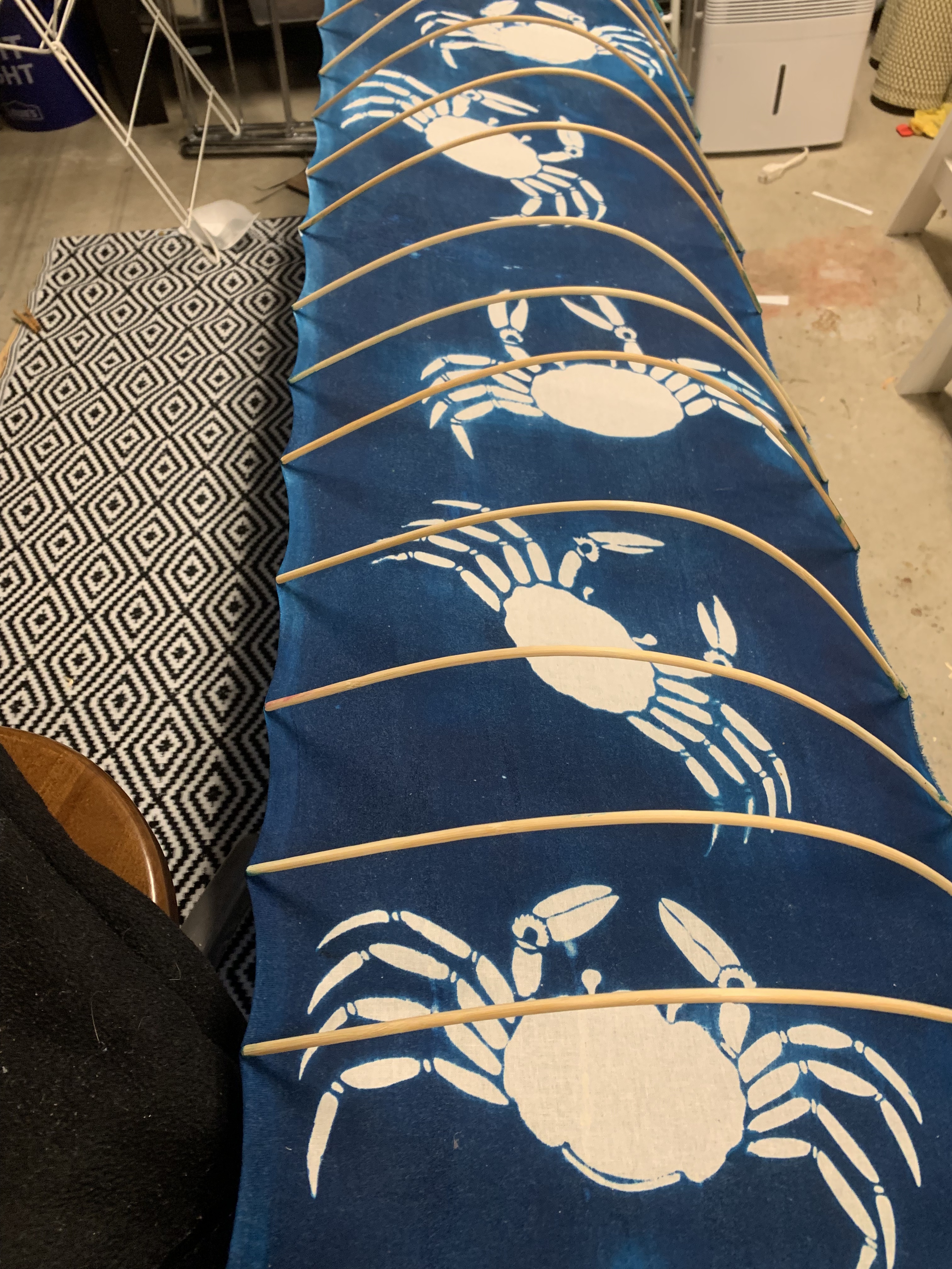 Secondly, underapplication of paste – if the paste is not mixed well or not applied thickly enough, then the dye will seep through. If the paste is too thick, it will crack, so I can’t just spatula paste on to solve the issue. This is mostly an experience issue, and I get a little better sense of how “thick” to mix the paste each time, and also by watching youtube videos of other dyers. Thirdly, if the stencil is disturbed while the paste is being applied, then it will smudge. One of the crabs has a ghosted outline because its stencil fell on it. For a small portion of the first bolt, I experimented with using an aluminum mesh frame on top of the stencil to help distribute the paste evenly. The mylar stuck to the aluminum frame when I went to lift it up and crashed onto its crab, smearing it. Normally, a silk mesh would be bonded to the persimmon stencil with urushii (lacquer), but urushii is highly toxic, and the appropriate substitute, cashew lacquer, is $60/oz in the US. I stopped using the frame for the rest of the bolt, and cleaned up the stencil as best I could with a small brush.