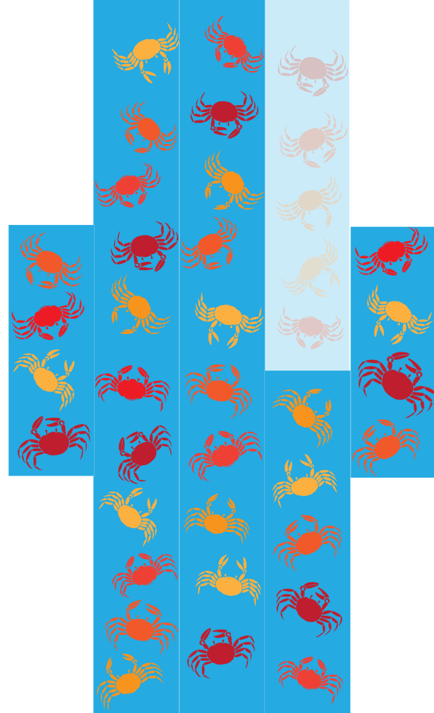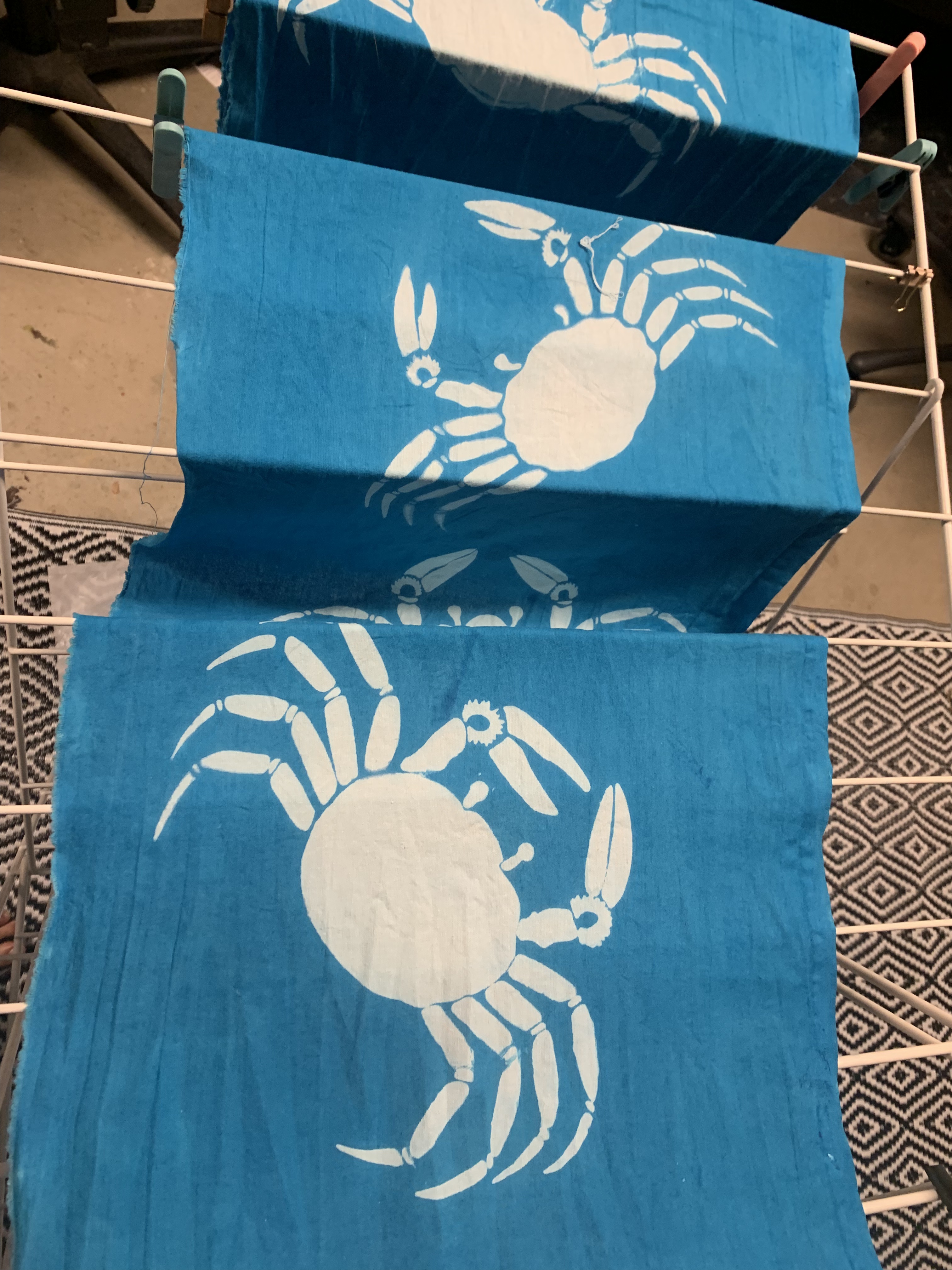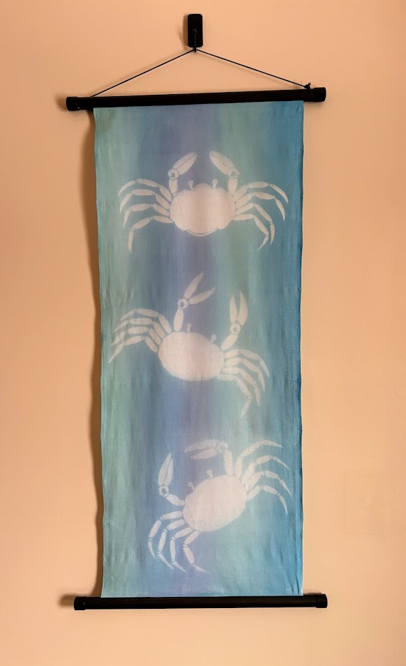 Overall, the resist paste worked as expected on the first crab bolt. Some crabs came out perfectly, whereas others did not. Additionally, the background color seemed very vibrant and even. I have some refinements to my technique to make because of errors in my process. Without a teacher, most of these errors can only be discovered organically. So I tried again with a second bolt, and fewer errors occurred. I plan to iterate this process until I cannot find any more improvements to make.
