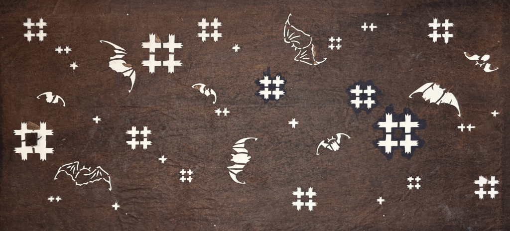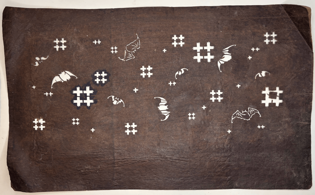 Bats are a symbol of prosperity in Japan and China because the pronunciation of bat in Chinese (fu) is the same as the word fortune (also fu). In Japan, the kanji for well, written 井, is also a symbol of prosperity and good luck. So this particular design is a very lucky design, with two different symbols for prosperity and good fortune, drawn many times.