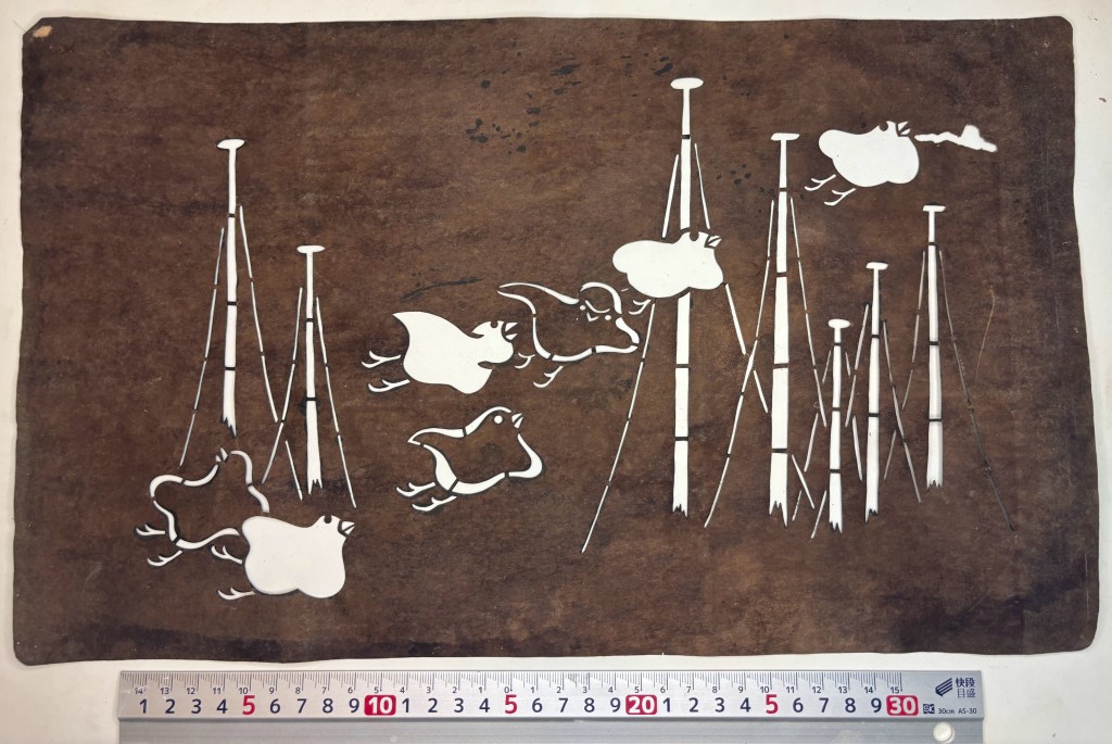 This stencil features plovers flying around ship masts. It uses a very clever strategy to draw the eyes without needing ito ire reinforcement.
