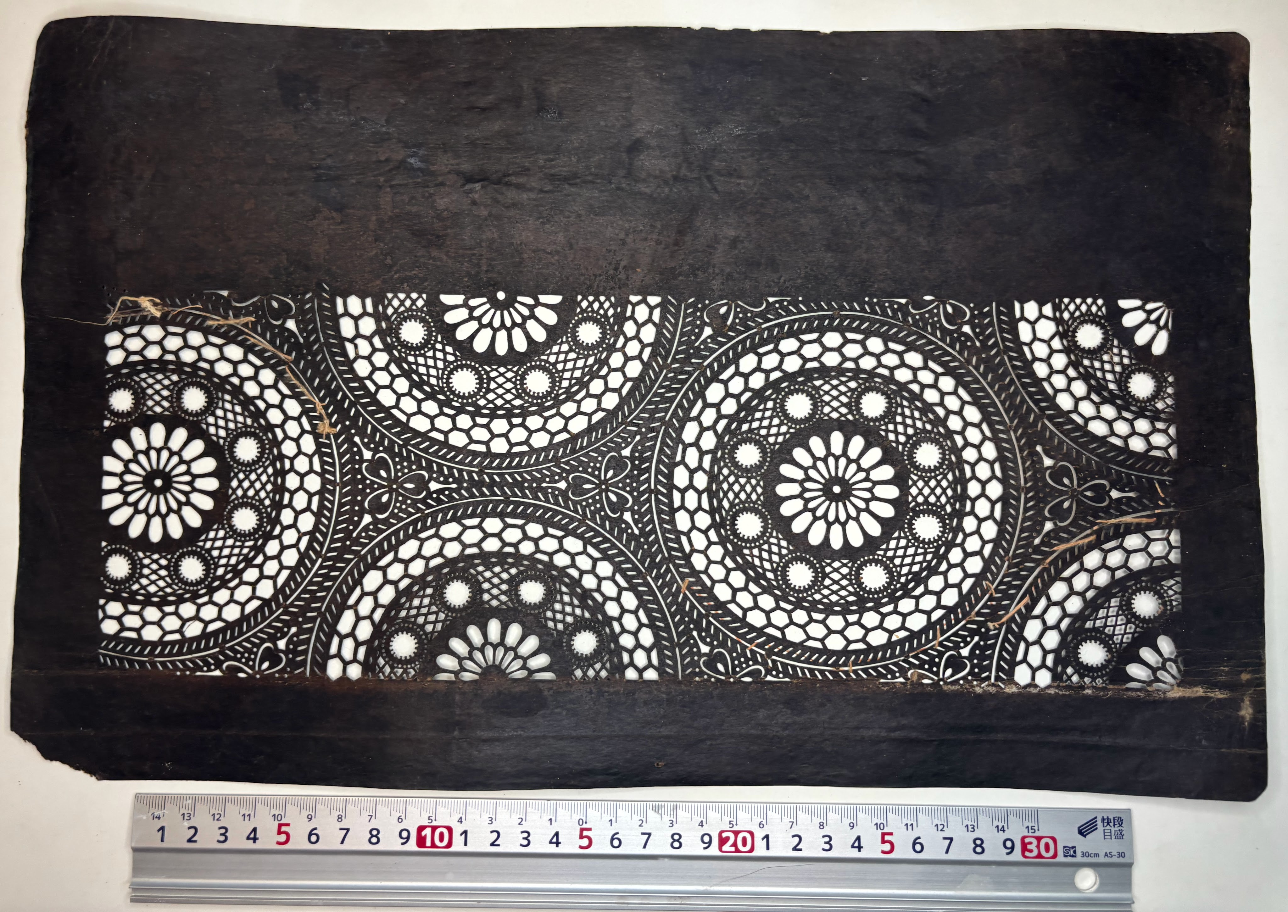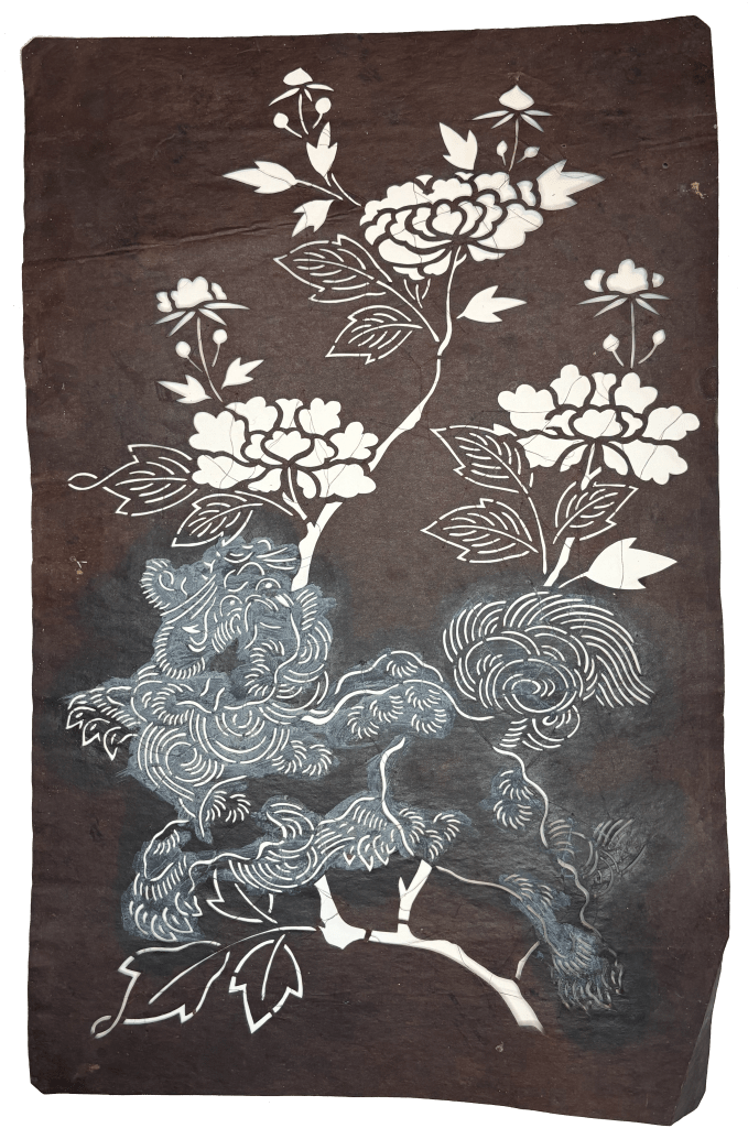 This intricate stencil features sakura flowers overlaid on a matsukawabishi, or pine bark diamond pattern, with a plaid background. I think this stencil was likely meant for katazome, and it would have produced a striking, beautiful motif that could have been dipped in indigo or colored in many different colors.