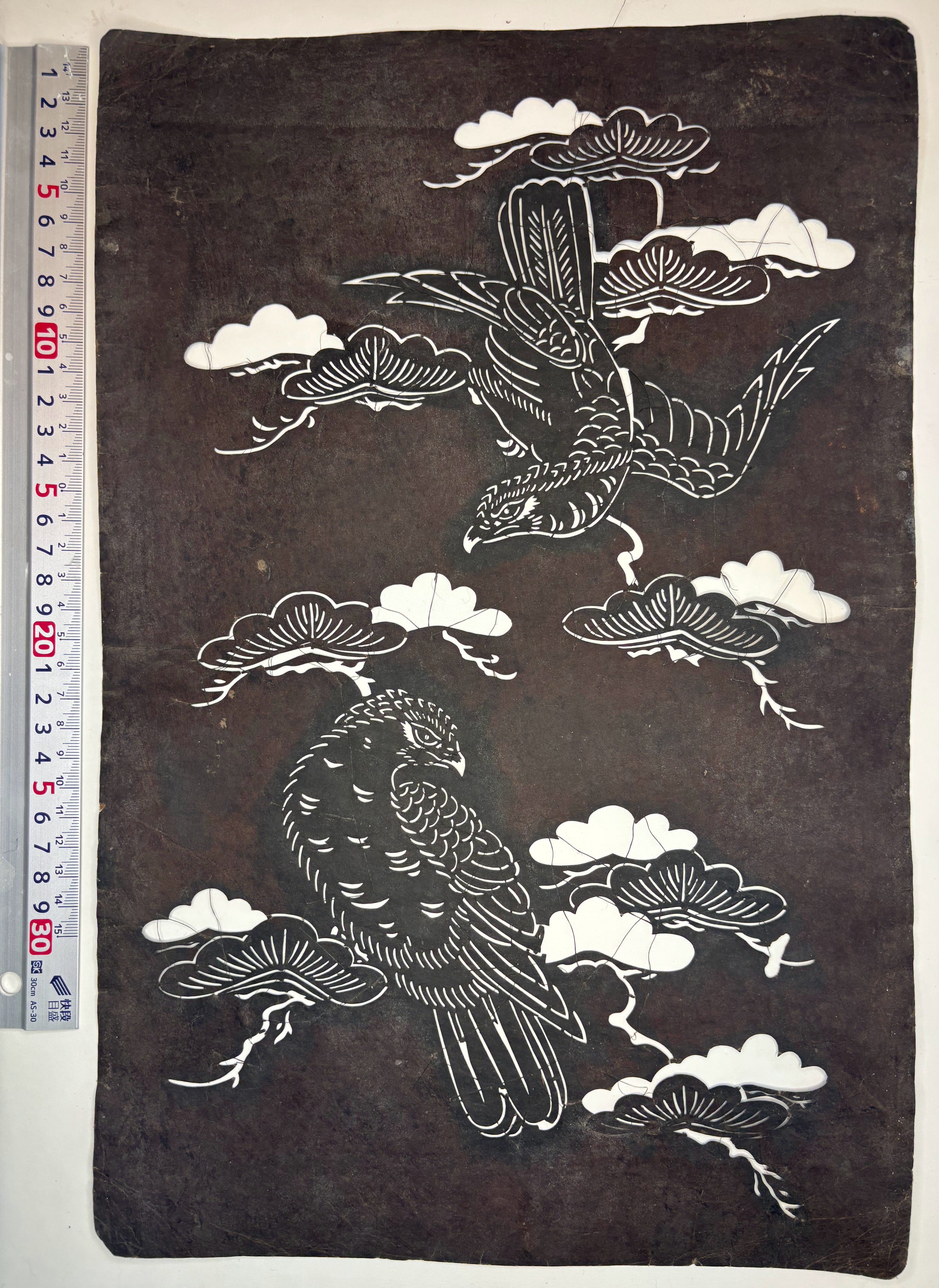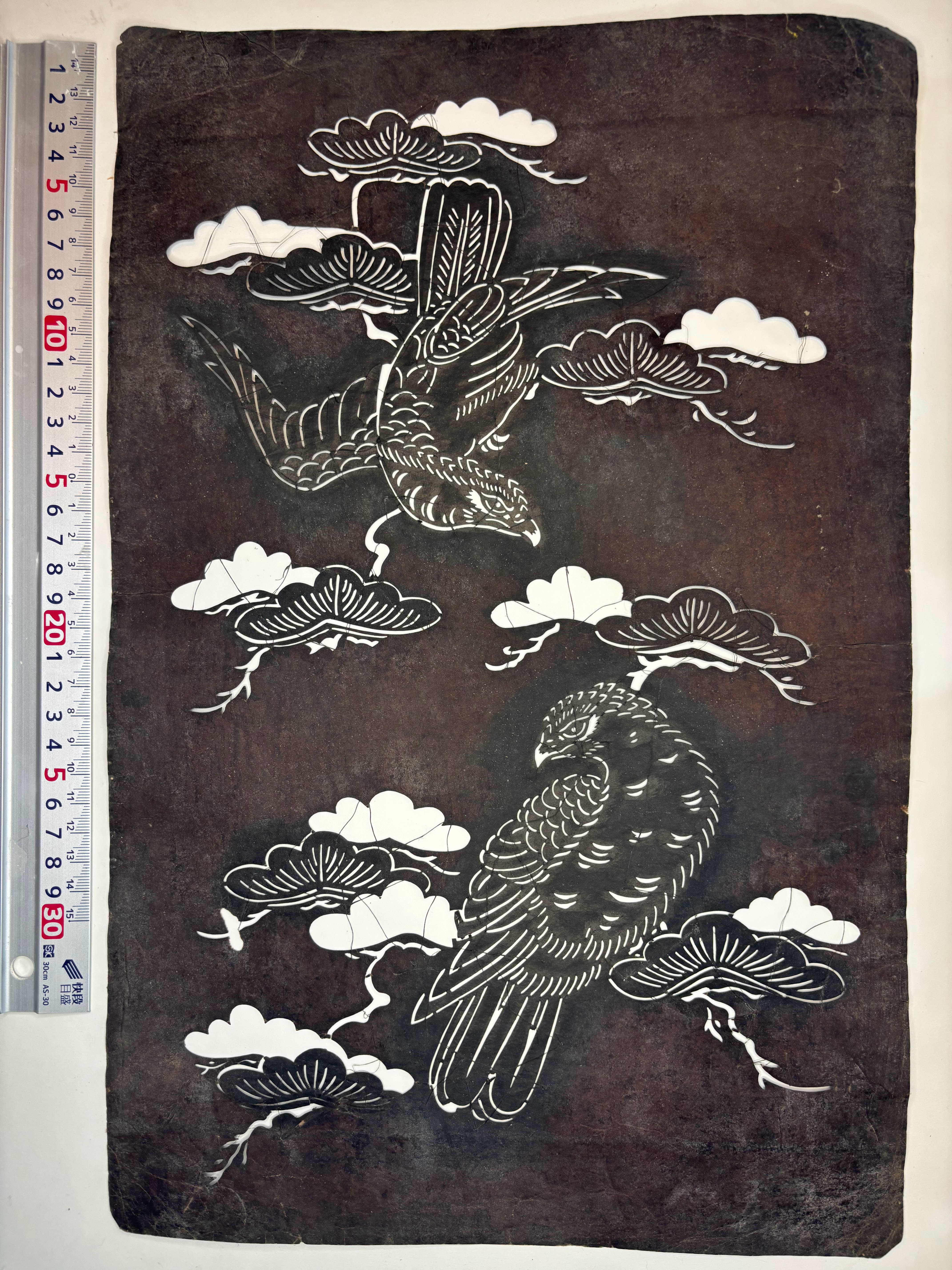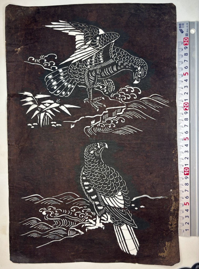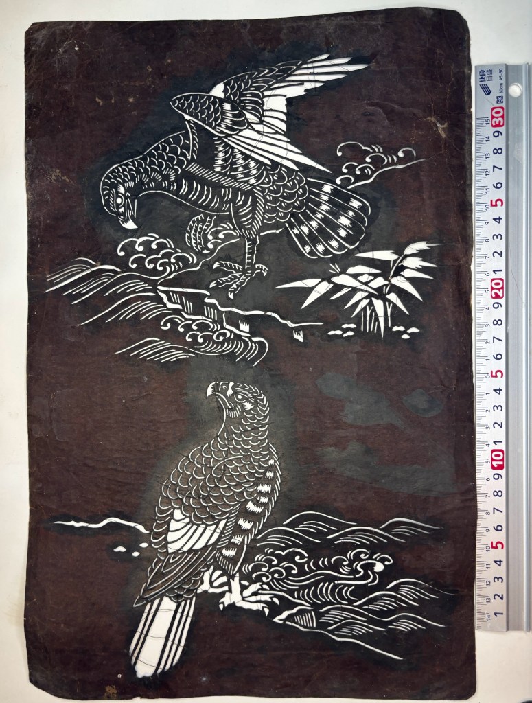 This stencil features waves, sasa leaves and hawks perched on cliffs, with sewn-in thread reinforcement.