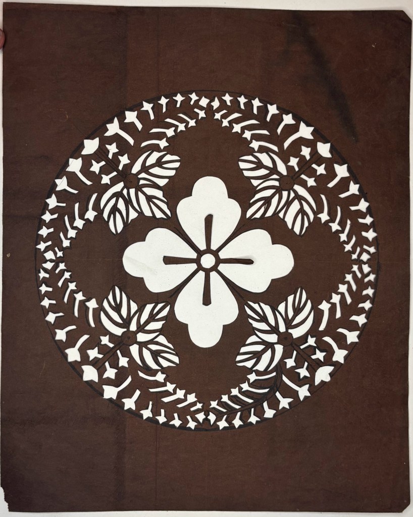 This stencil is a crest design of a hanabishi and paulownia. I think this particular version of hanabishi is called 花角, or flower square. I can’t find the crest on iroha kamon, so it might be rare. Because there is no reinforcement, I was able to trace it digitally and you can see how it would look with a purple dye.
